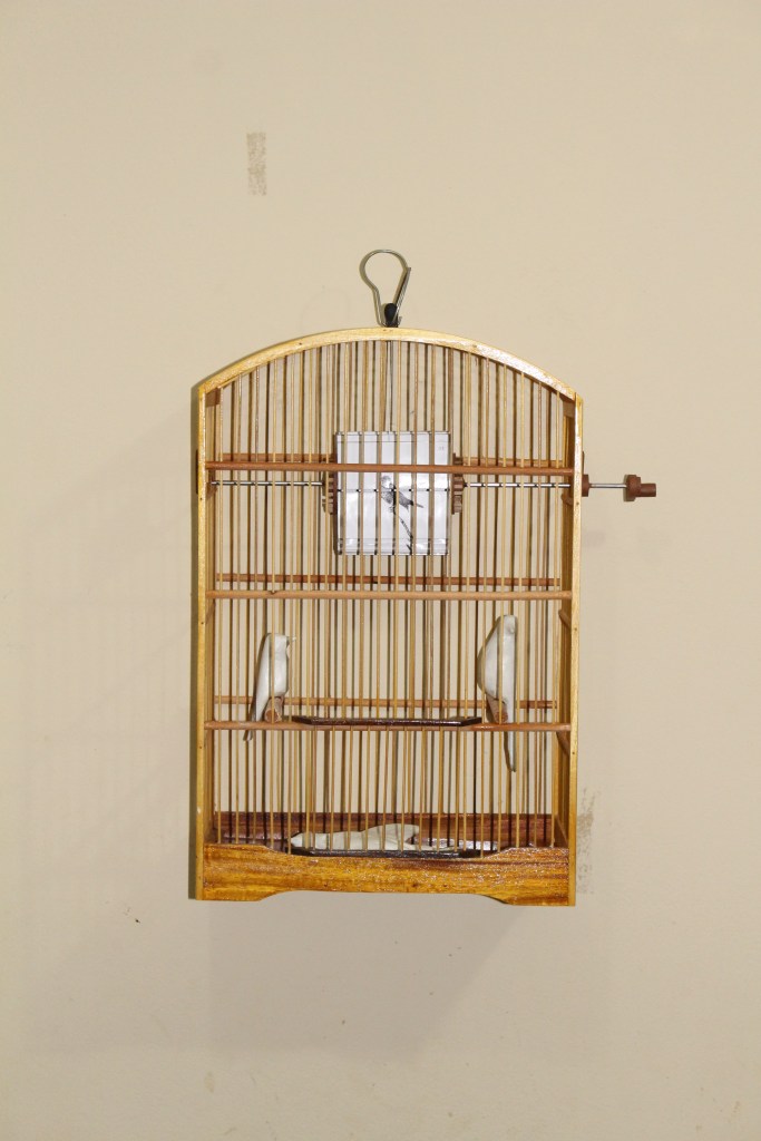 Objeto – gaiola de madeira, mutoscópio com animação em tinta acrílica, esculturas em polímero