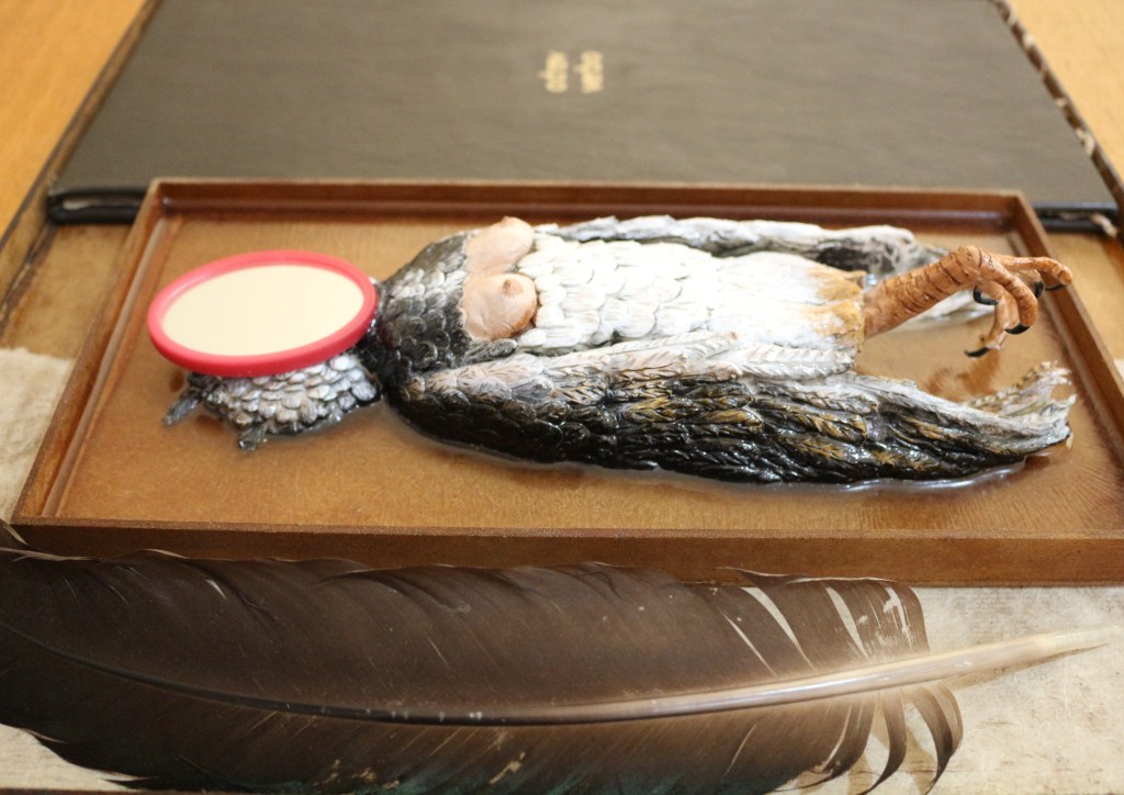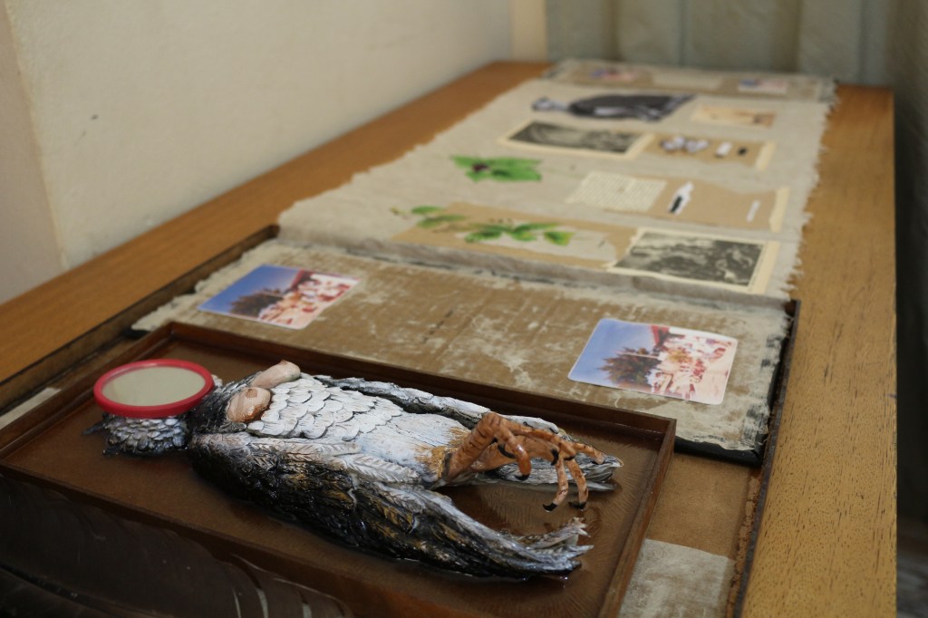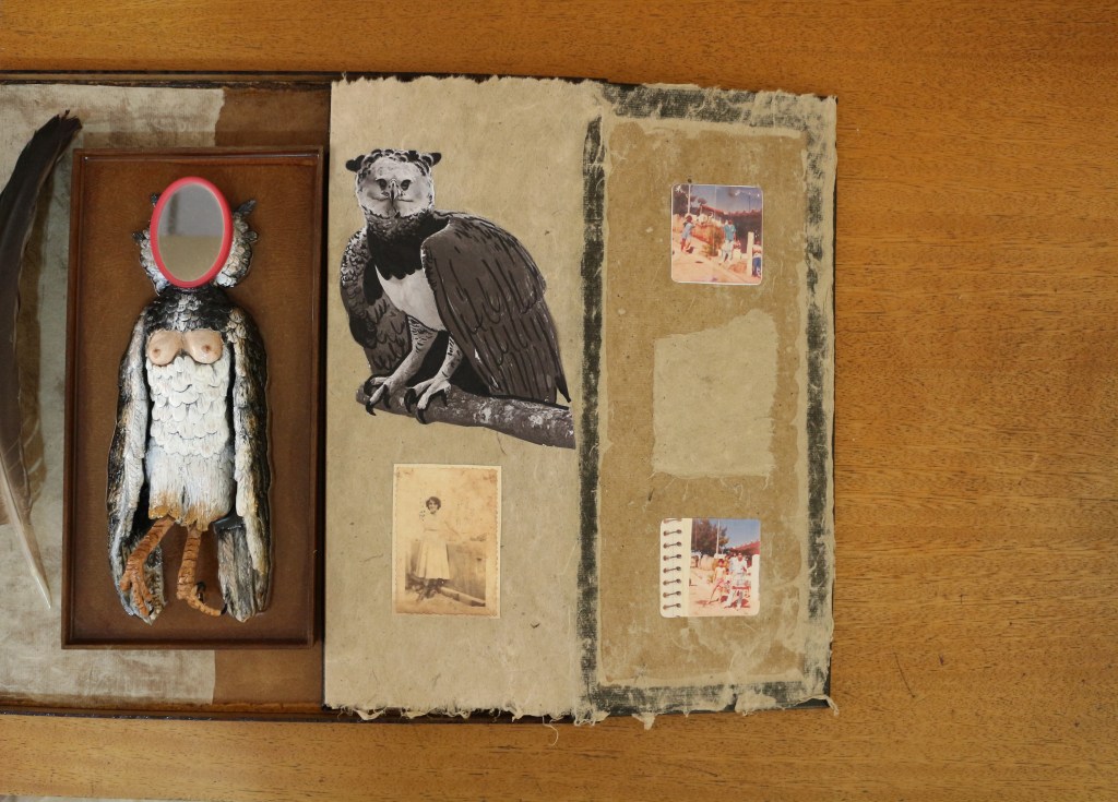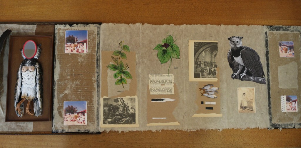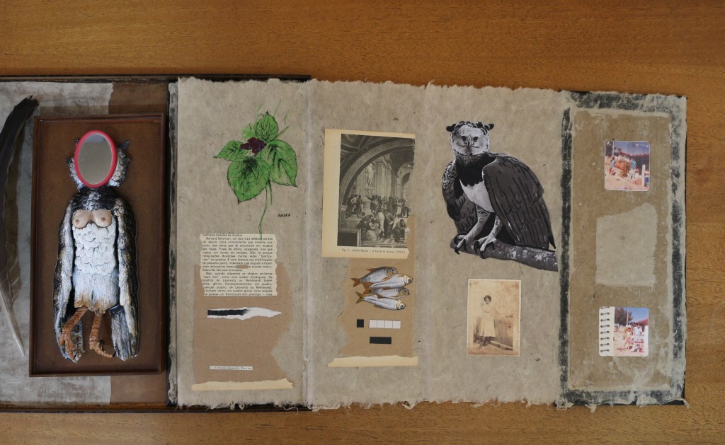 Objeto – caixa de madeira, argila, resina, espelho, livro e pena.