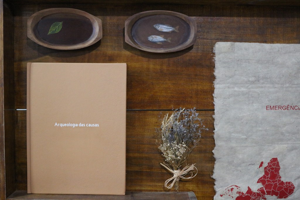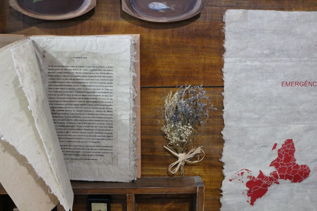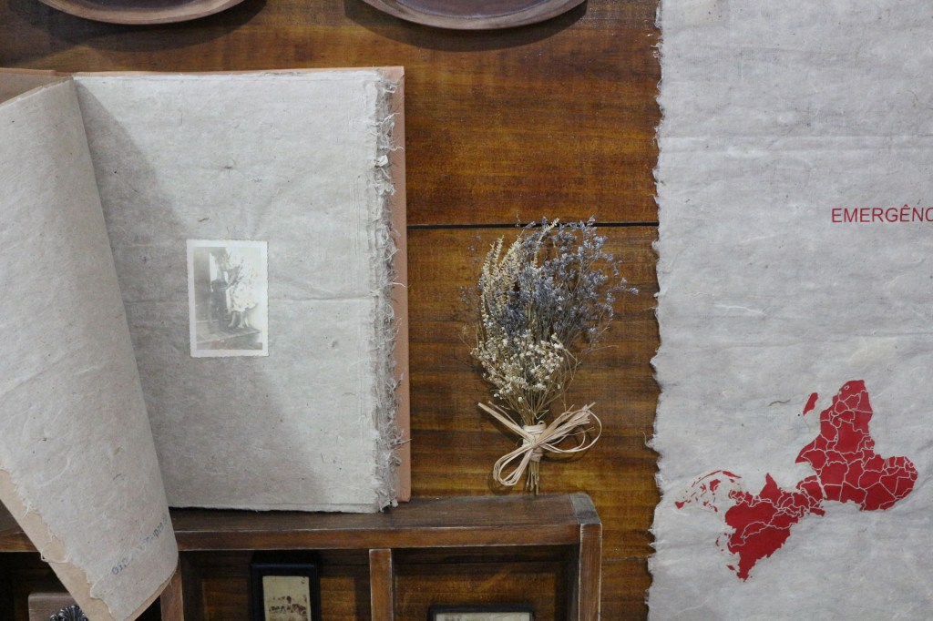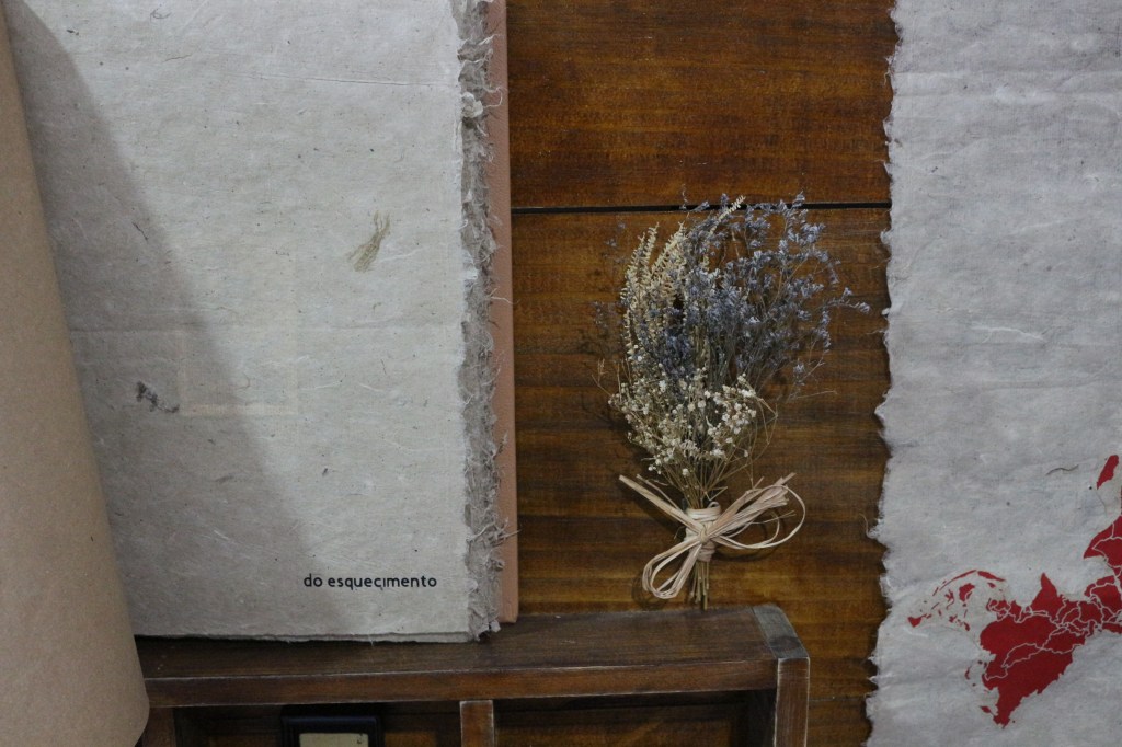 A folha ao lado do livro, sobre a qual estão gravados a palavra “emergência” e os mapas invertidos da América do Sul, Ásia e África – continentes frequentemente designados como “emergentes” no discurso geopolítico contemporâneo – tem como referência a obra América Invertida, de Joaquín Torres Garcia, que propõe uma subversão da lógica colonial, atribuindo ao Sul um lugar de centralidade, inserindo uma crítica ao modelo capitalista de exploração e em como essas regiões são submetidas a processos de precarização do trabalho e desculturação.