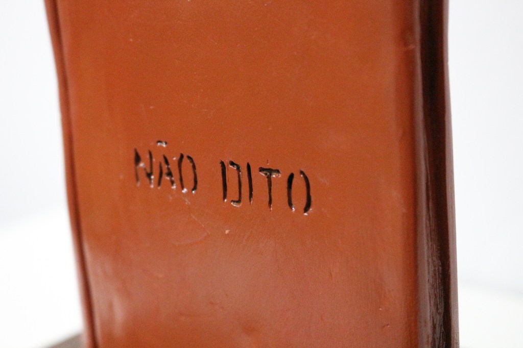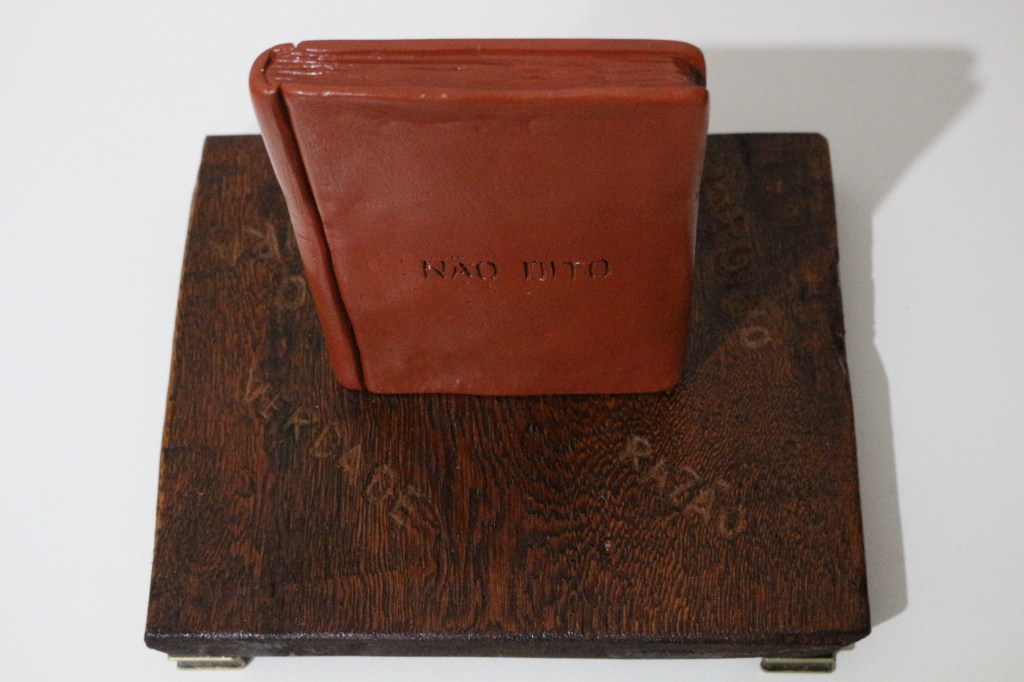 Inspirada no gesto silencioso de Brígida Baltar, este trabalho utiliza a argila para moldar um livro fechado, corpo fossilizado de um dizer que nunca se deu. Na superfície, a inscrição não dito ecoa não como ausência, mas como vestígio. Erguido sobre madeira, o livro permanece fechado, como ruína, matéria endurecida, memória calada.