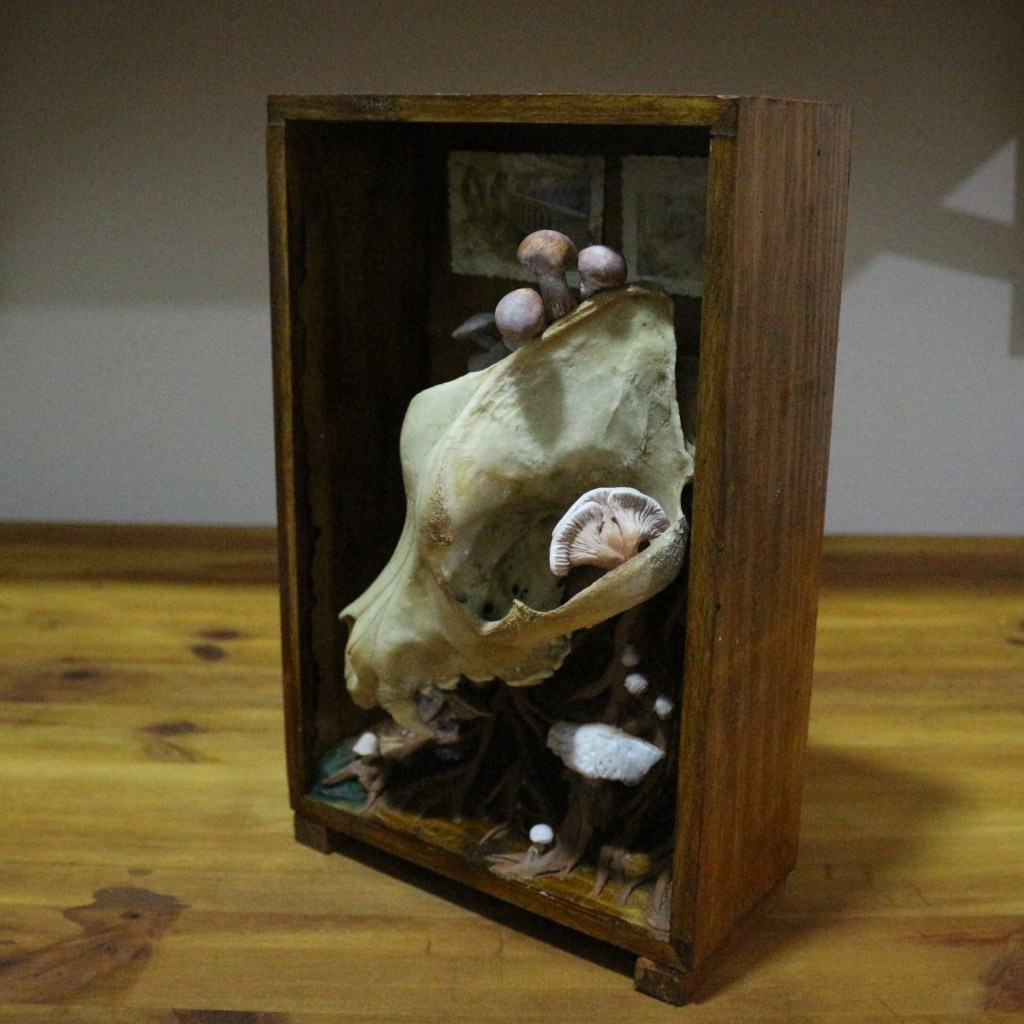 caixa de madeira com pés de madeira, crânio natural de animal canídeo, fungos e cogumelos em cerâmica fria, fotografias vernaculares e resina.